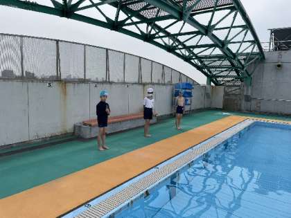 写真は、3年生の授業の様子です。校長先生の話に続いて、代表児童がクラスごとに、水泳学習に向けてのめあてを話しました。水泳運動の学習のねらいや、プールでの約束事を確認し、人数確認(バディ)、準備運動をし、シャワーを浴びてからプールに入りました。