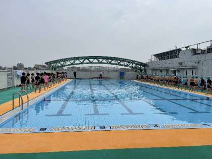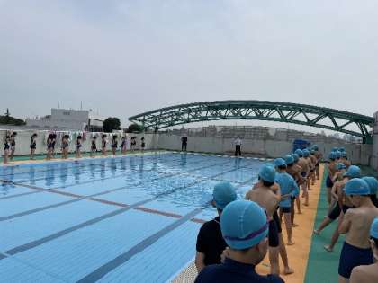今日はプール開きでした。1・2時間目は3年生、3・4時間目は1年生、5・6時間目は2年生の1・2組がプール開きをしました。