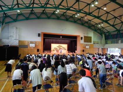 6年生の古典芸能鑑賞教室がありました。みどりの学び舎の上北沢小、経堂小の6年生を迎えて、本校の体育館で行いました。いつものステージが、能の舞台に仕立てられ、本物の演者による狂言「附子」を鑑賞しました。事前に詳しい説明や後半のワークショップで演じてみるなど、狂言を楽しく学ぶことができました。
