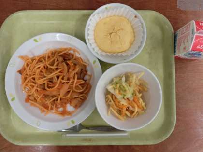 献立は「スパゲッティナポリタン、じゃがいものハニーサラダ、パインケーキ、牛乳」です。