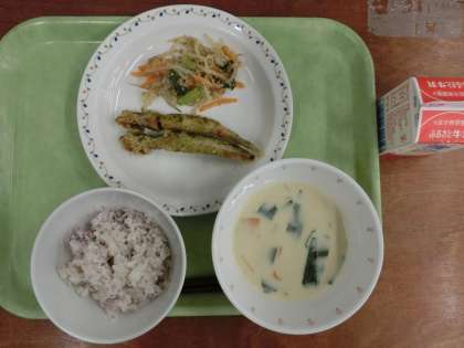 献立は「ゆかりごはん、ししゃもの磯辺揚げ、野菜にごまあえ、みそ汁、牛乳」です。