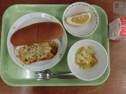 献立は「黒砂糖パン、ラザニア風、キャベツサラダ、河内晩柑、牛乳」です。