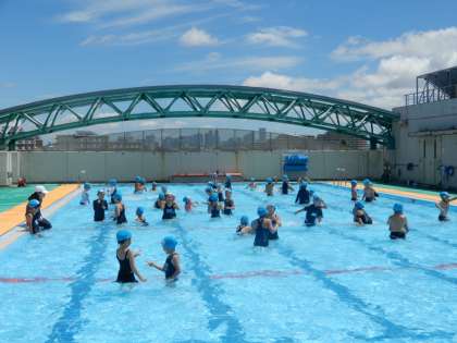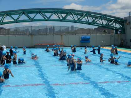 今日はとてもよい天気です。3年生と1年生のプールがありました。みんな楽しそうに泳いでいました。今日で夏休みの水泳指導は終わります。