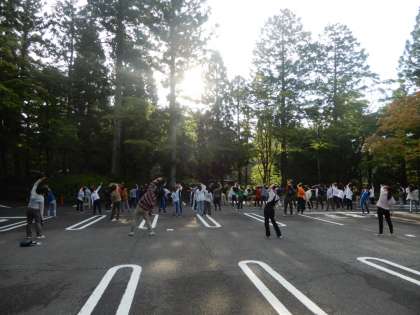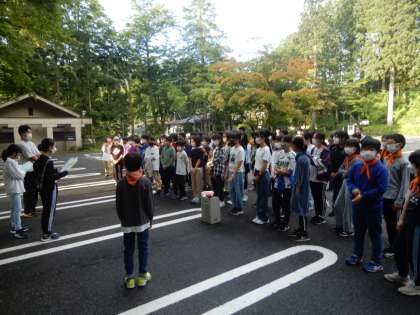 朝会では、学校長と代表の人の話に続いて、ラジオ体操を行いました。いい天気です。