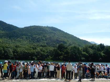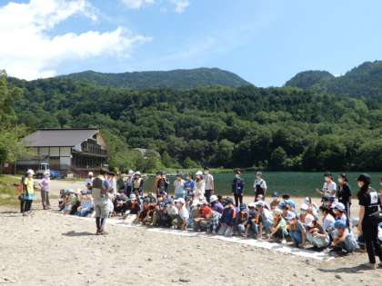?湯の湖畔で、学年全体の集合写真を撮りました。卒業アルバム用です。とってもよい天気です。