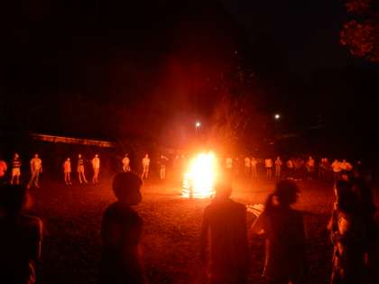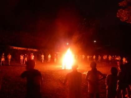 夜のお楽しみは、キャンプファイヤーです。雨の日が多かったので、実施できるのは久しぶりなのだそうです。やはりついている子供たちです。