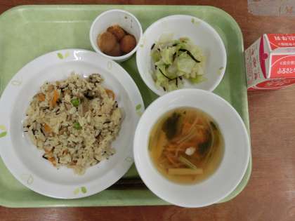 献立は「五目ごはん、沢煮椀、キャベツの塩こんぶかけ、月見だんご、牛乳」です。
