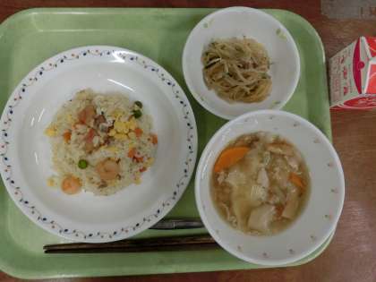 献立は「チャーハン、もやしのコチュジャンかけ、ワンタンスープ、牛乳」です。
