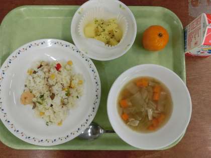 献立は「ピラフ、じゃがいものチーズ焼き、野菜スープ、冷凍みかん、牛乳」です。