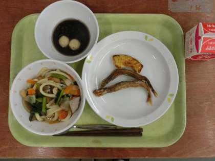 献立は「けんちんうどん、ししゃものからあげ、てんぷら(かぼちゃ)、白玉ぜんざい、牛乳」です。