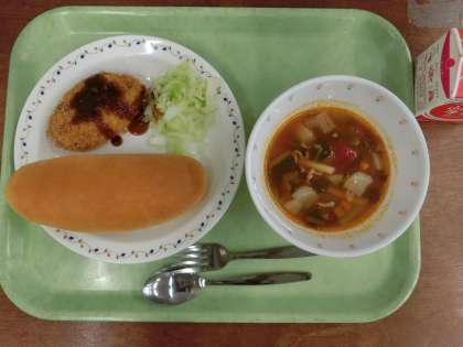 献立は「コッパパン、コロッケ、ゆでキャベツ、ミネストローネ、牛乳」です。