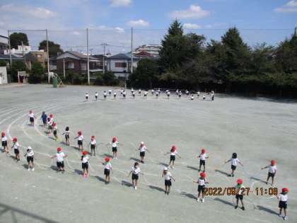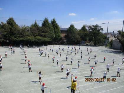 2年生は、「ちょうせん!最後まであきらめない!みんなで楽しもう!」を合言葉にフラフープを使ったダンスの練習に励んでいます。フラフープの腰回し、腕回し、なわとび跳びは少しずつ上手にできるようになってきました。リズムに合わせながらの隊形移動やオリジナル技が見せ場です。子供たちが体いっぱいに表現している姿をぜひお楽しみください。