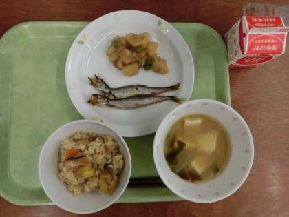 献立は「秋の香りごはん、焼きししゃも、じゃが芋の甘辛煮、みそ汁、牛乳」です。