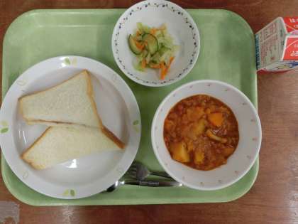 献立は「二色サンド、トマトシチュー、野菜サラダ、牛乳」です。