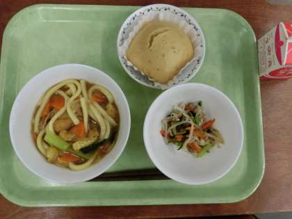 献立は「カレーうどん、おひたし、黒砂糖蒸しパン、牛乳」です。