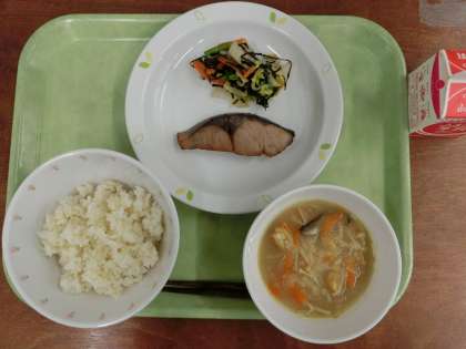 献立は「ごはん、魚のてり焼き、白菜と小松菜ののりあえ、みそ汁、牛乳」です。