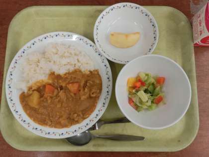 献立は「カレーライス、トロピカルサラダ、りんご、牛乳」です。