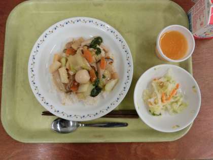献立は「中華丼、キャベツと大根のサラダ、キャロットゼリー、牛乳」です。
