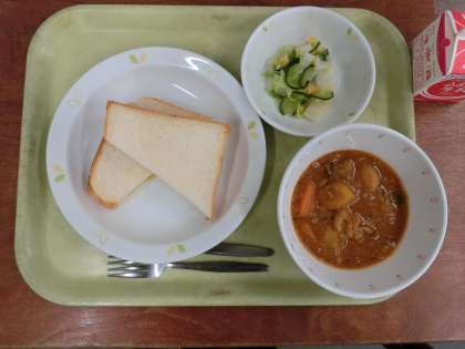 献立は「ジャムサンド、ハンガリアンシチュー、白菜とコーンのサラダ、牛乳」です。
