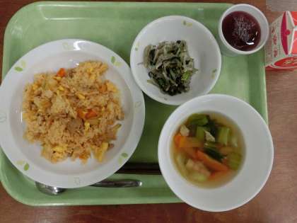 献立は「キムチチャーハン、中華スープ、塩ナムル、ぶどうゼリー、牛乳」です。
