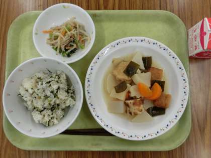 献立は「菜飯、おでん、野菜のごまあえ、牛乳」です。