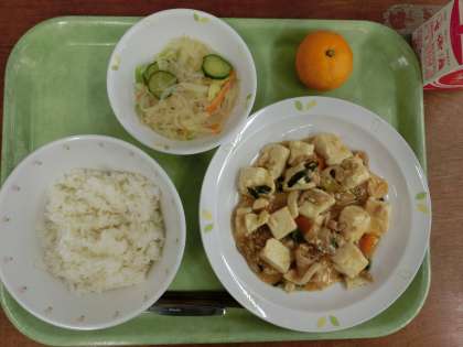 献立は「ごはん、家常豆腐、春雨サラダ、みかん、牛乳」です。