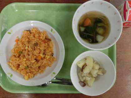 献立は「チキンライス(卵添え)、ジャーマンポテト、野菜スープ、牛乳」です。