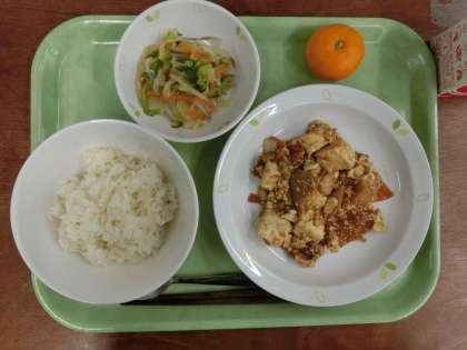 献立は「ごはん、四川豆腐、白菜の中華サラダ、みかん、牛乳」です。