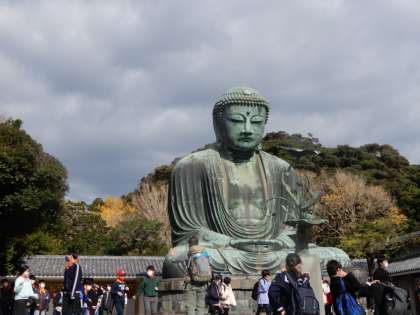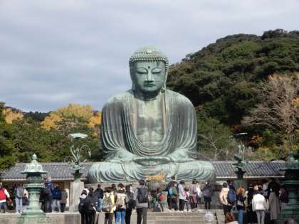 大仏見学。高徳院で国宝を拝みました。学年全体で集合写真を撮りました。