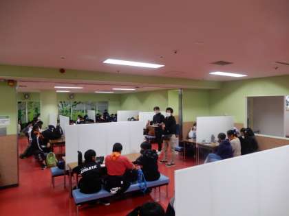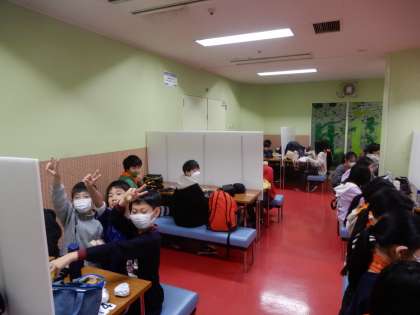 昼食タイム。こども宇宙科学館の休憩室で、お弁当をいただきます。いつも通り、静かに食べます。