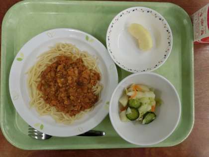 献立は「スパゲッティミートソース、ポテト入りフレンチサラダ、りんご、牛乳」です。