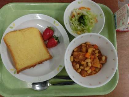 献立は「フレンチトースト、ポークビーンズ、野菜のドレッシングかけ、いちご、牛乳」です。