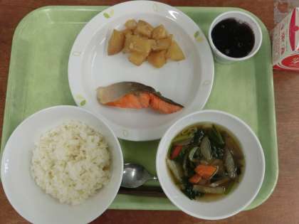 献立「ごはん、魚の塩焼き、じゃがいもの甘辛煮、せたがや根菜汁、ぶどうゼリー、牛乳」です。