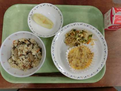 献立は「ひじきごはん、切干大根の卵焼き、もやしのコチュジャンかけ、りんご、牛乳」です。