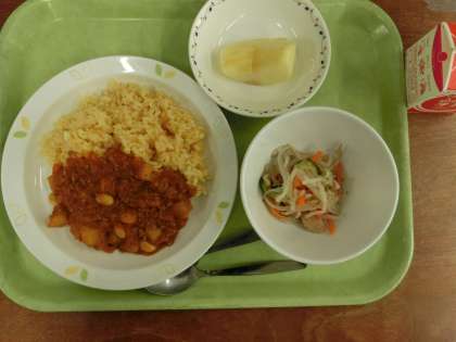 献立は「チリビーンズライス、もやしとツナのサラダ、りんご 牛乳」です。