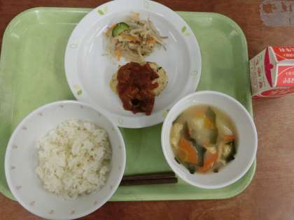 献立は「ごはん、豆腐入りハンバーグ、こんにゃくサラダ、みそ汁、牛乳」です。