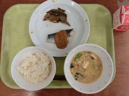 献立は「ごはん、魚のごまだれかけ、くきわかめの炒め煮、きのこ入りかきたま汁、牛乳」です。