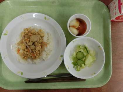 献立は「親子丼、野菜のひとしお、白玉だんご、牛乳」です。