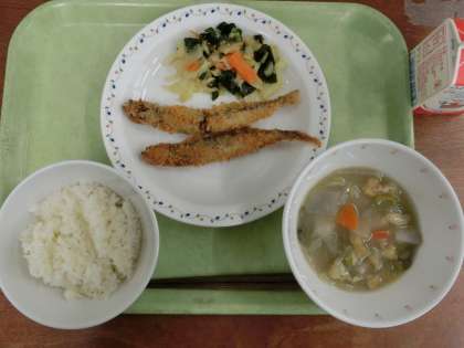 献立は「ごはん、ししゃものフライ、和風サラダ、呉汁、牛乳」です。