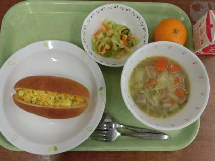 献立は「卵チーズトースト、ポトフ、コーン入りフレンチサラダ 津之望、牛乳」です。