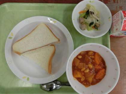 献立は「ジャムサンド、ビーンズシチュー、野菜ソテー、牛乳」です。