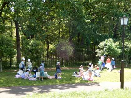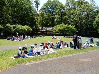 お弁当タイム。緑の絨毯の上で、グループごとに仲良くいただきました。風が心地よいです。