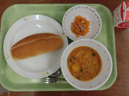献立は「マーマレードサンド、ハンガリアンシチュー、にんじんサラダ、牛乳」です。