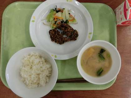 献立は「ごはん、魚のごまフライ、野菜の和風ドレッシング、みそ汁、牛乳」です。