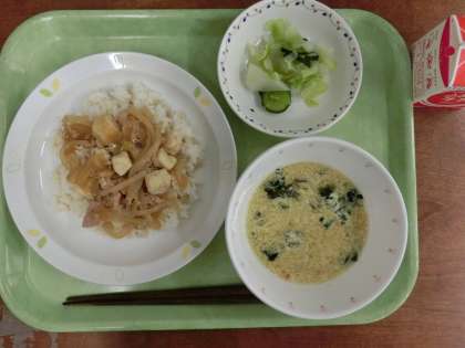 献立は「豚丼、ひとしお野菜、かきたま汁、牛乳」です。
