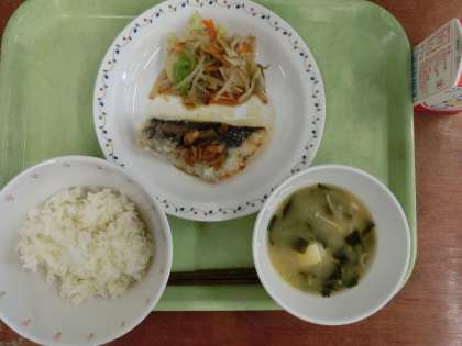 献立は「ごはん、魚の南蛮あげ、キャベツともやしのおかかかけ、みそ汁、牛乳」です。