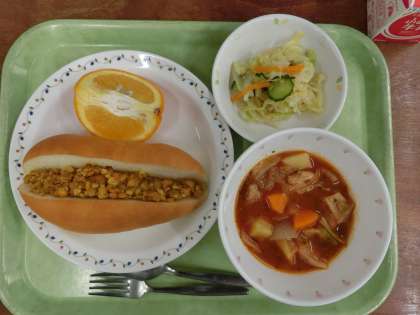 献立は「大豆ドライカレーサンド、ボルシチ、野菜のイタリアンドレッシングかけ、甘夏みかん、牛乳」です。