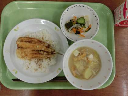 献立は「魚のかば焼丼、和風サラダ、みそ汁、牛乳」です。