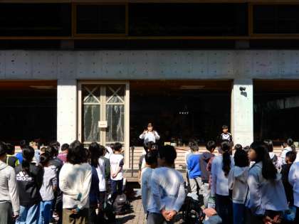 閉室式。2日間お世話になったビレジの方に、お礼を言いました。校旗を降納し、校歌を歌って村めぐりに出発しました。
