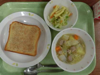 献立は「セサミトースト、ポトフ、マカロニとキャベツのサラダ、牛乳」です。